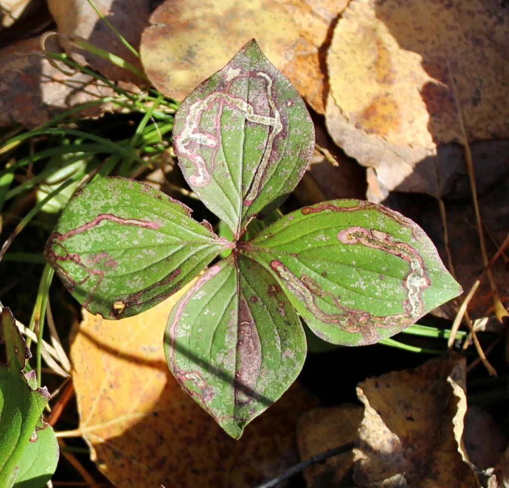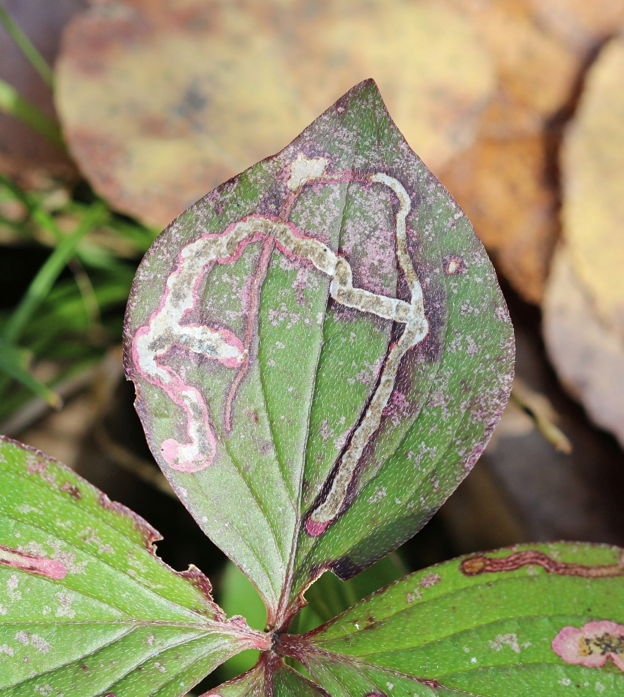 Every leaf of this bunchberry has a leaf mine.