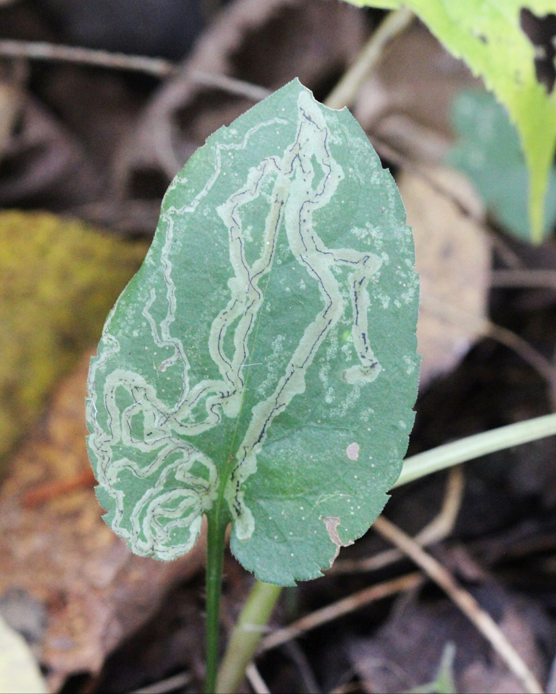 Out on my walks in the woods late last month, I came across five more serpentine leaf mines. The first was in a big-leaf aster (Eurybia macrophylla), which is shown in the photo at the top of the page. The other four were in wild red columbine (Aquilegia canadensis), coltsfoot (Petasites palmatus), goldenrod (Solidago gigantea), and bunchberry (Cornus canadensis). I couldn’t find larvae in any of them, but I think I have a good idea of what made them.