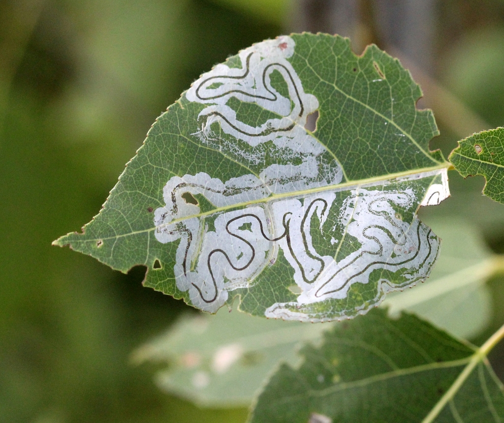 Recently, I’ve become more interested in leaf mining insects after finding what might be the serpentine leaf mine of a Stigmella moth in a blackberry leaf. This wasn’t the first moth leaf mine I have found. In 2017, I identified another leaf mining moth, Phyllocnistis populiella, recognizing it from its leaf mine in a balsam poplar leaf.