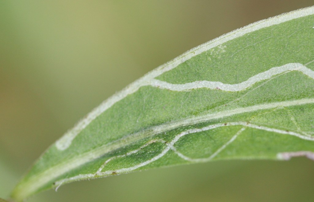 A leaf mine in a big-leaf aster leaf that was probably made by the larva of an Ophiomyia sp., a genus of leaf-mining flies.