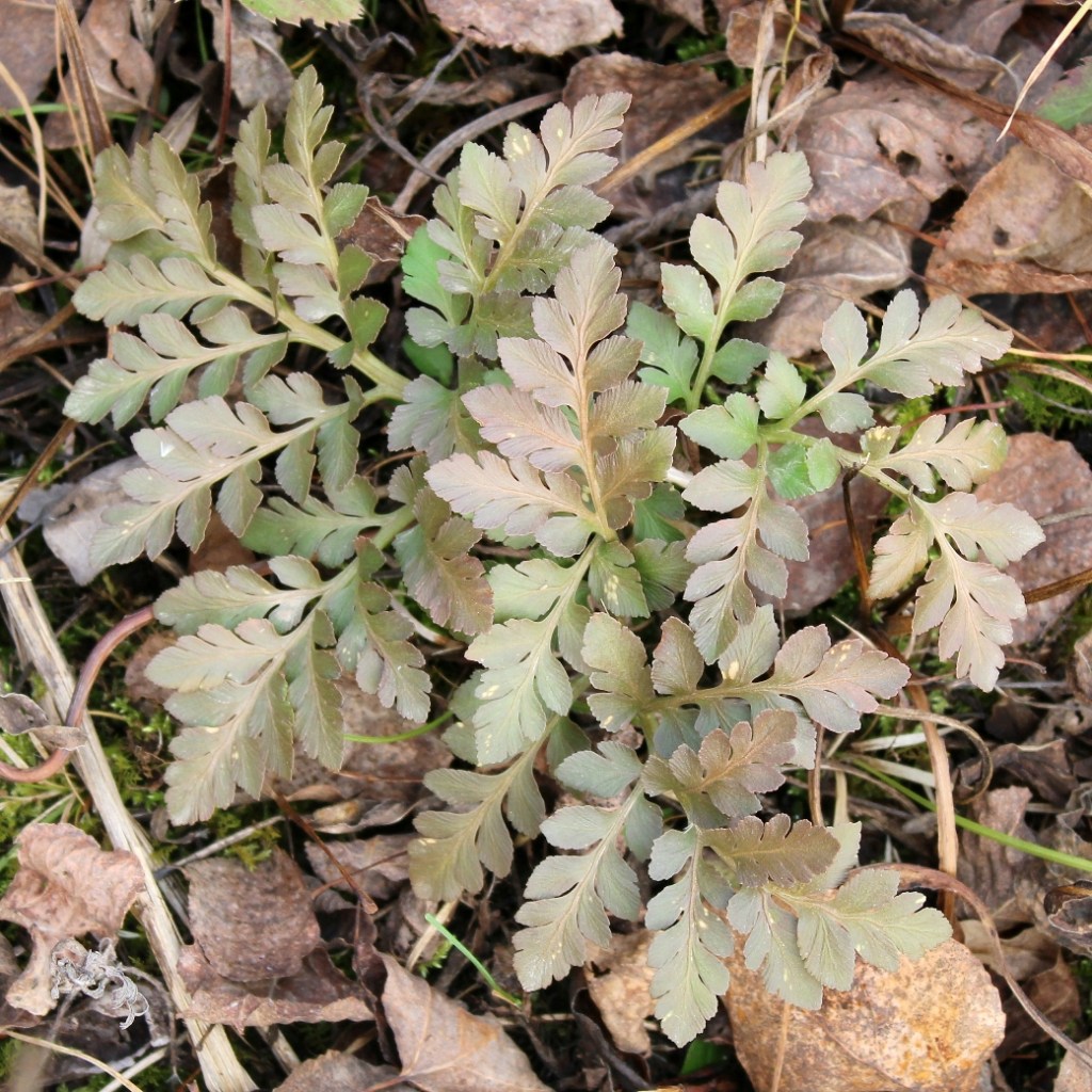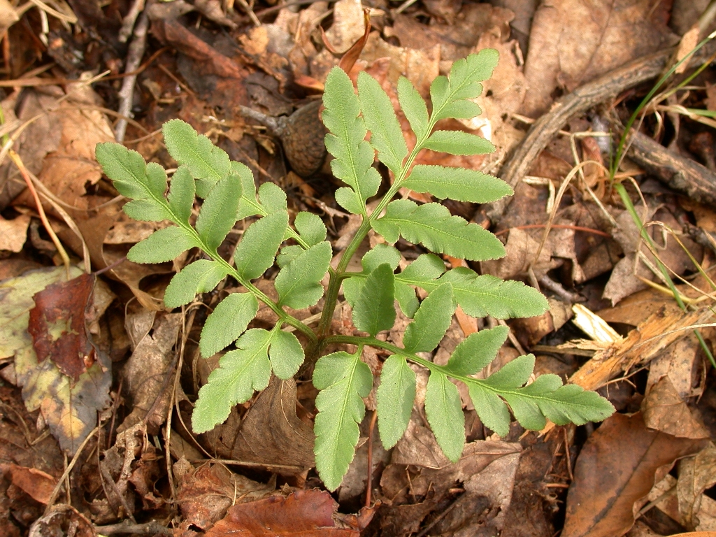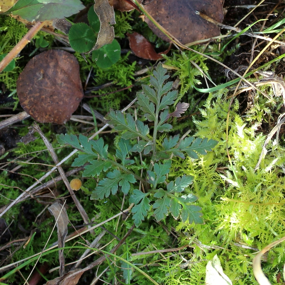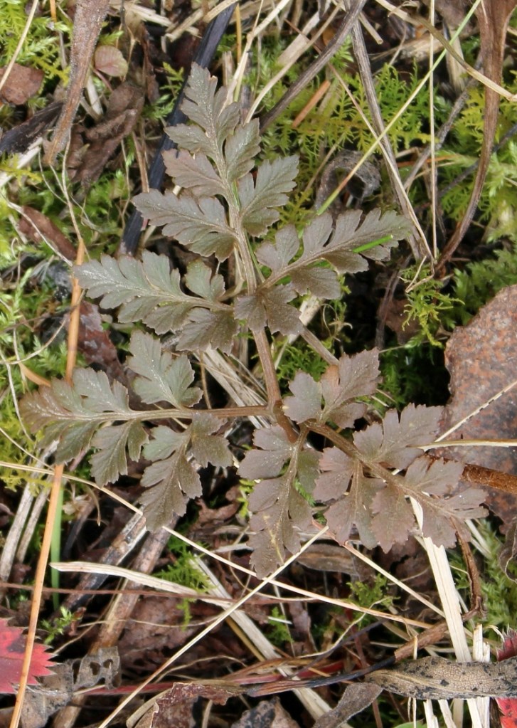 Sceptridium rugulosum (St. Lawrence Grape Fern) in November and turning slightly purple in the colder weather. Unless protected from the cold by leaf litter, the fronds turn a bronzy purple. In the spring, they turn green again.