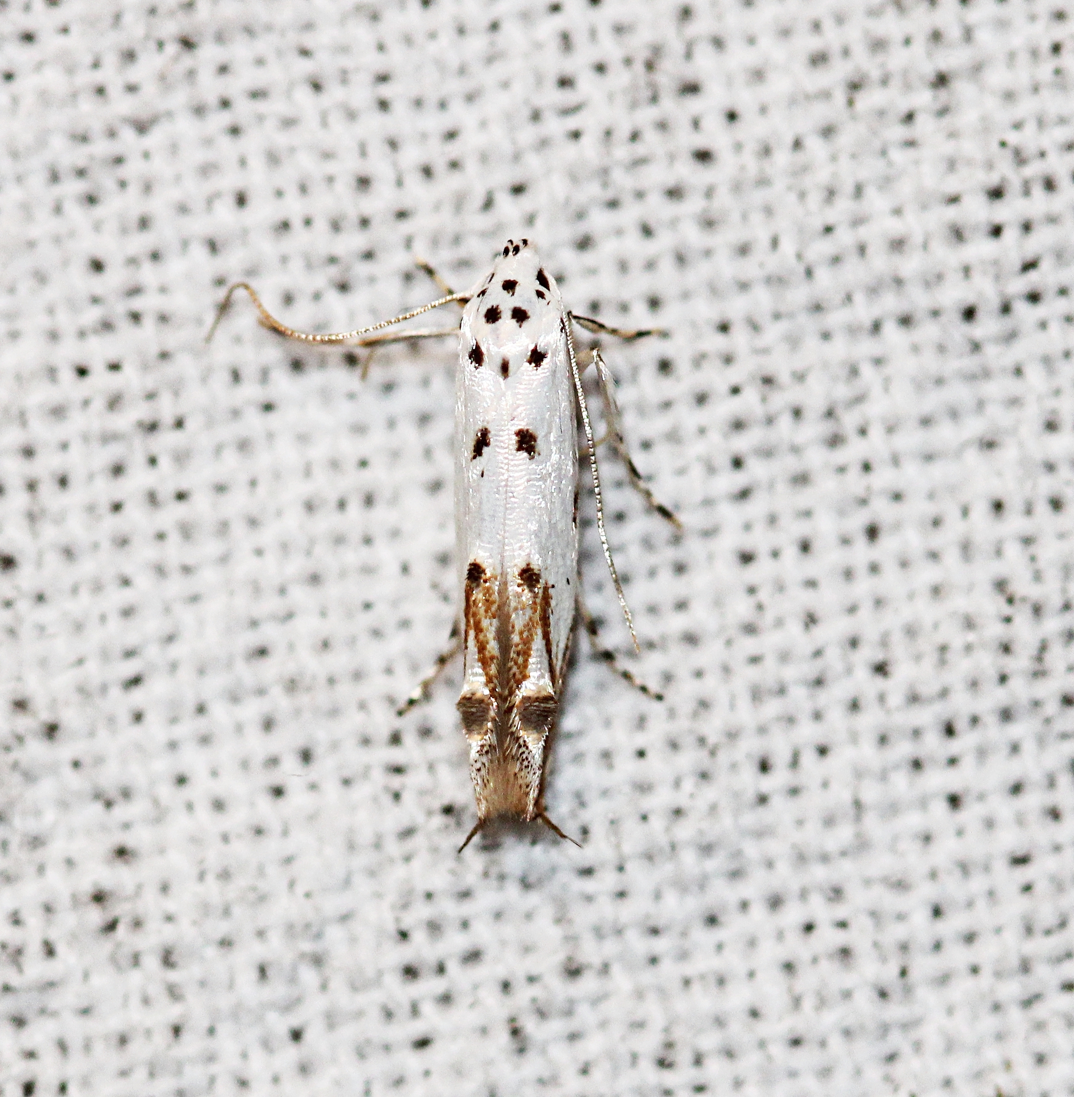 This is Mompha eloisella (Red-streaked Mompha), a tiny moth with beautiful satiny white wings speckled with symmetrically placed dark brown spots on the head, thorax, and wings, and red diagonal lines on the wing tips. The patterning of the wing tips resembles a face, but who or what will notice something that small and possibly be deterred by it? Or maybe that’s what the markings are for at all.