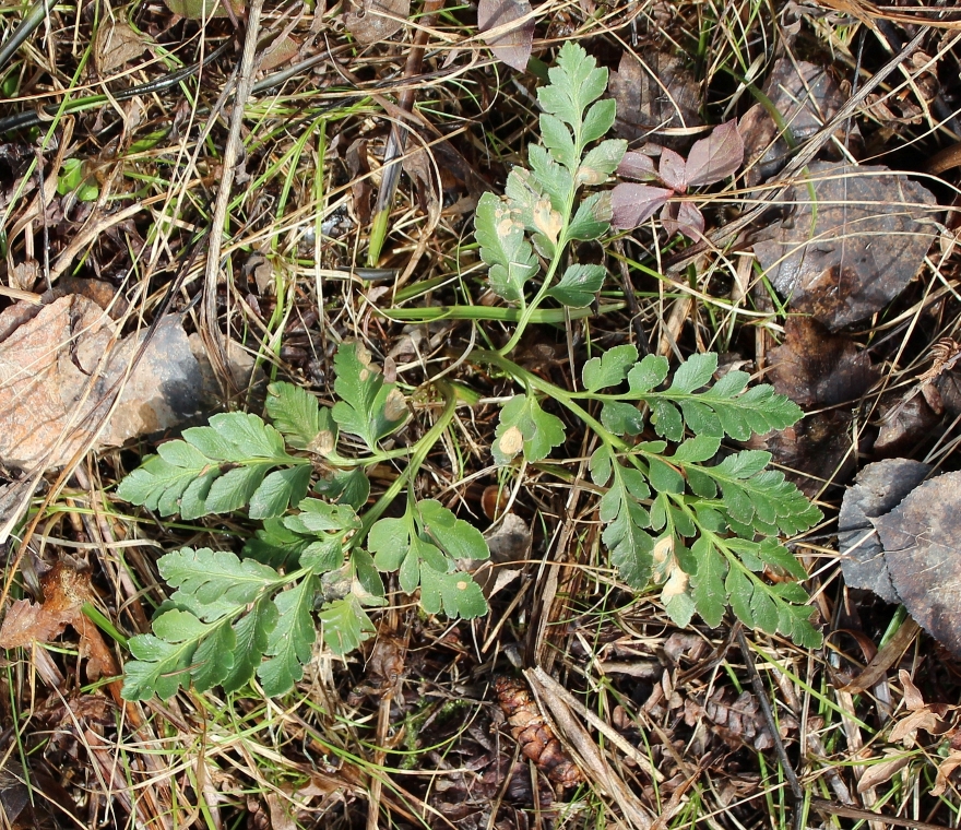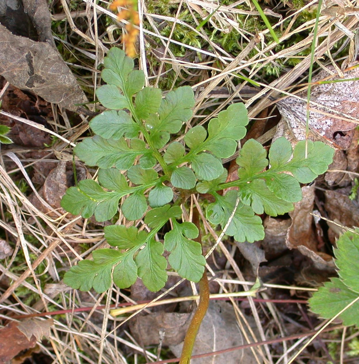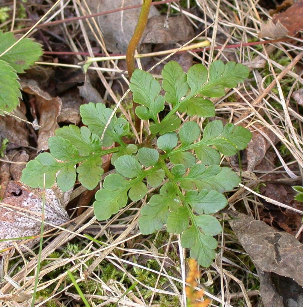 Grape ferns (Sceptridium) and their relatives, the moonworts (Botrychium), are an odd bunch. They grow from stubby subterranean stems with a few thick roots. The stems produce one leaf, rarely two, a year. That leaf is succulent, divided into two parts, one of which is photosynthetic (trophophore), the other reproductive (sporophore). They have a series of buds, one above the other on the subterranean stem, for the next five or so years of leaves.